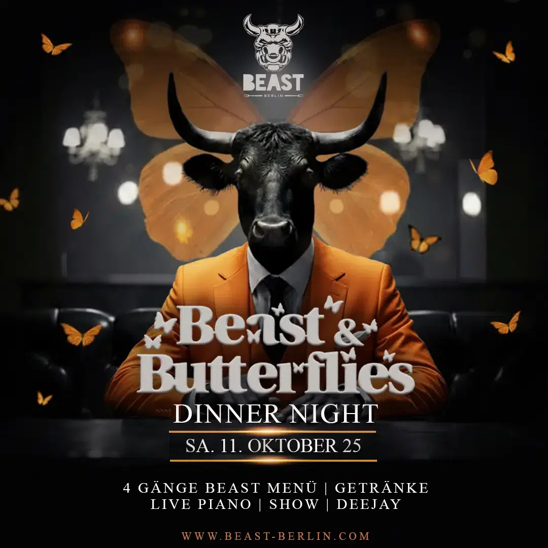 Experience an extraordinary evening that seduces all the senses; with culinary delicacies, a unique ambience and an exuberant atmosphere at theBeast & Butterflies – Dinner Show Night on Saturday October 11th, 2025 at BEAST BERLINdirectly on Alexanderplatz (former Escados)!
